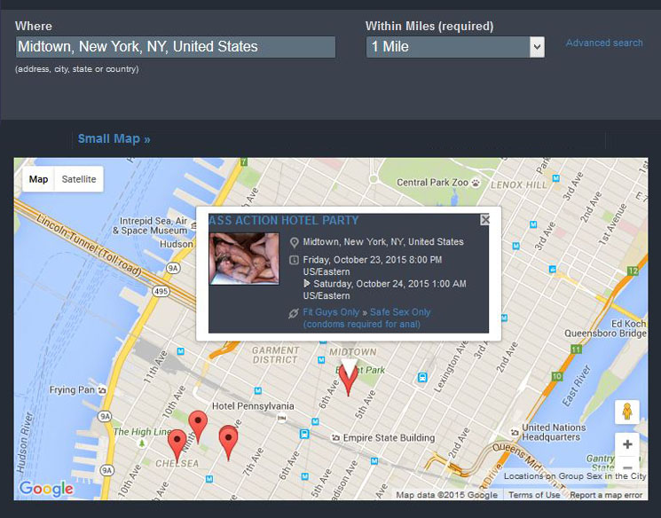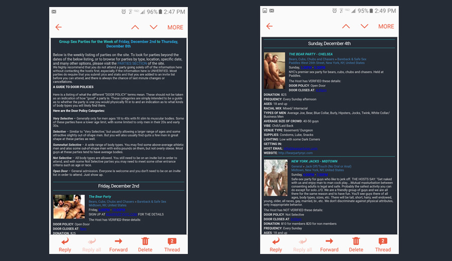 - View parties listed by risk level, such as safe-sex parties, bareback parties, or parties with both.