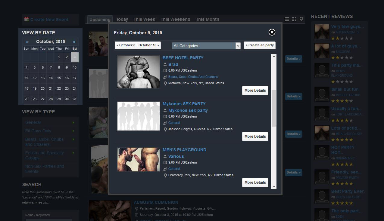 - View parties by category, such as bear parties, fit/athletic men parties, fetish parties etc.